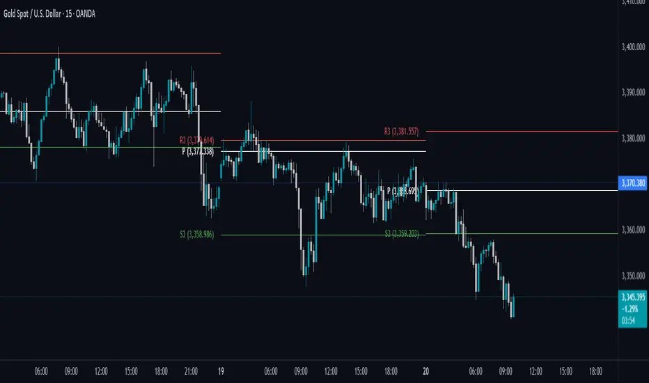 Наблюдение: Следете нивата P (бяло), S3 (зелено) и R3 (червено) за ключови ценови зони и получавайте аларми при пресичания.