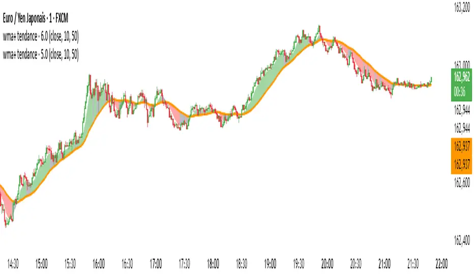 Wma+ tendance is a visual trend indicator that uses two Weighted Moving Averages (WMA) – a fast and a slow one – to clearly highlight market direction. It fills the space between the two WMAs with dynamic colors and includes alerts for trend changes.