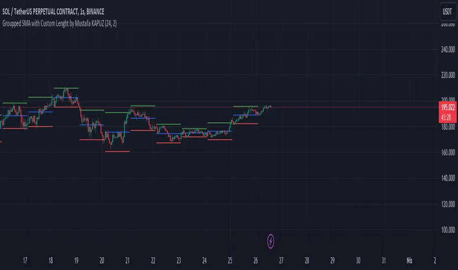 Grouped Calculation: Instead of calculating the SMA on a rolling basis, this script groups the data in sets of n (as per the user-defined length) and calculates the SMA for each group. After each group, the calculation resets.