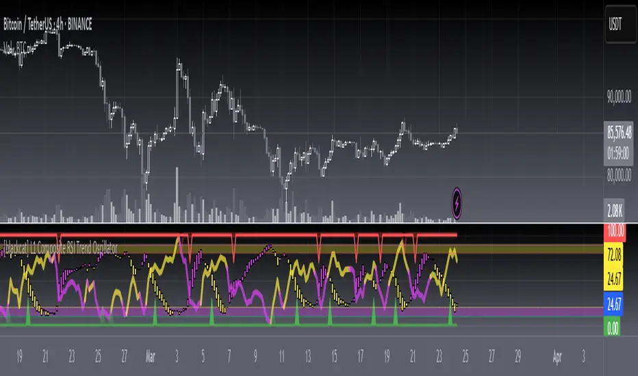 OVERVIEW The [blackcat] L1 Composite RSI Trend Oscillator is an advanced technical analysis tool combining Relative Strength Index (RSI), weighted moving averages, and price momentum metrics to visualize market trends and generate actionable trading signals through dynamic threshold zones and crossover patterns.