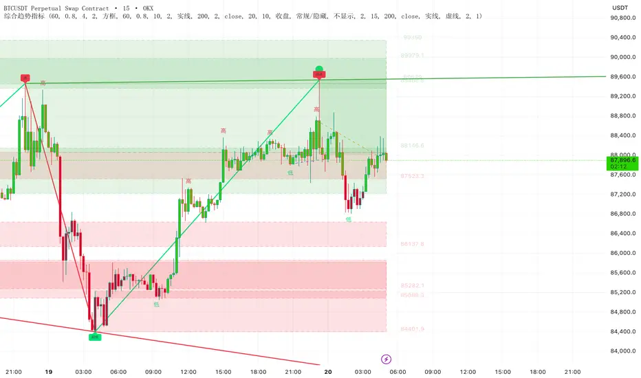 Trend recognition: Based on ZigZag (depth/deviation/backtracking adjustable) annotation HH/HL/LH/LL, draw high and low point lines and labels, and selectable up/down trend coloring and BOS dot hints.