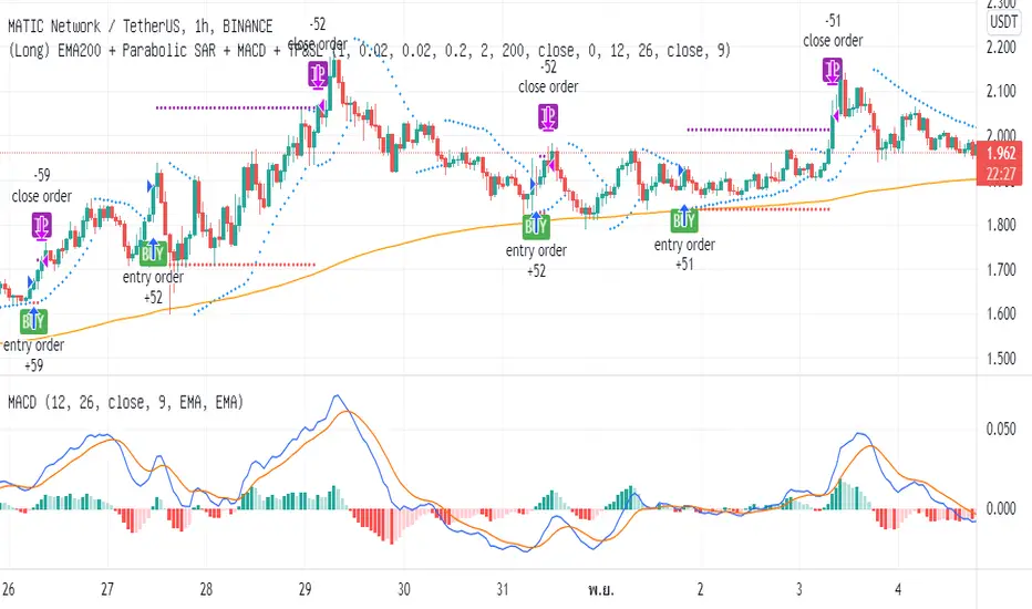 This indicator is backtest of “ (Long) EMA 200 + Parabolic SAR + MACD + Take Profit and Stop Loss”