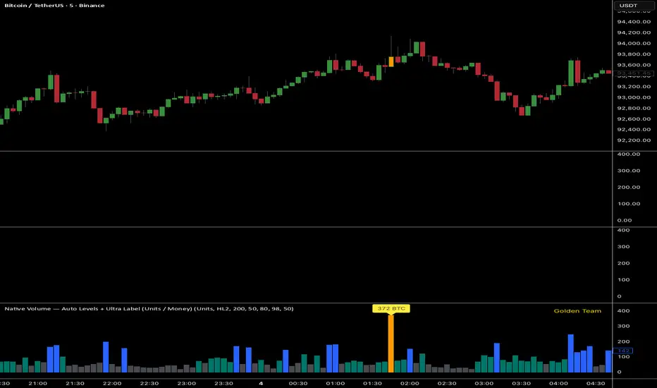 This indicator classifies volume bars into four categories — Low, Medium, High, and Ultra — using rolling percentile thresholds. Instead of fixed cutoffs, it adapts dynamically to recent market activity, making it useful across different symbols and timeframes. Ultra-high volume bars are highlighted with labels showing compacted values (K/M/B/T) and the appropriate unit (shares, contracts, ticks, etc.).