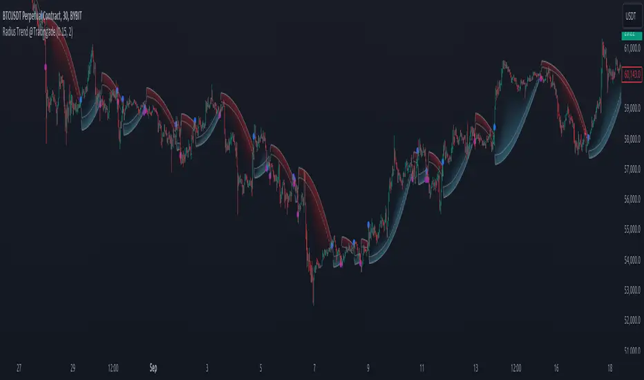 The Radius Trend indicator is a tool that helps traders see market trends more clearly by using a flexible line that changes based on price movement and volatility. Instead of a straight trend line, it acts like a sweeping radius, adjusting as the market moves. This makes it easier to spot the trend’s direction, strength, and possible reversal points.