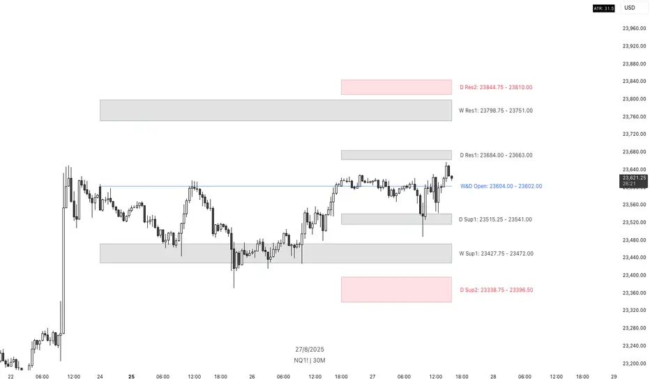 When daily and weekly levels align closely, they merge into combined zones with enhanced significance. Labels show both the mean and median values when they differ meaningfully.