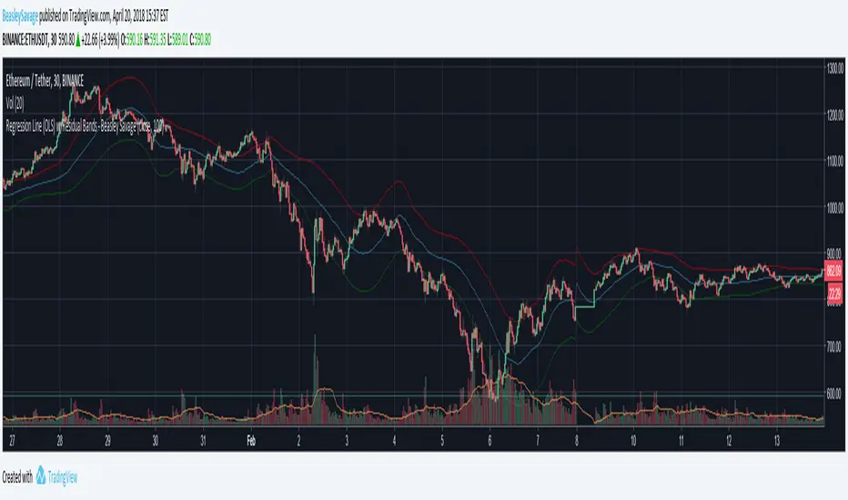 Plots linear regression "line of best fit" for a given source and length. Also plots the standard deviation of residuals as upper and lower bands. For some reason it's not plotting the lines exactly where the values are, so I wouldn't recommend using it as a purely visual indicator, but it could be used in strategies. A quick implementation of a strategy buying when the close crossed over the lower band and selling when close crossed under the upper band resulted in ~60-70% trade accuracy, not taking into account commission/slippage.