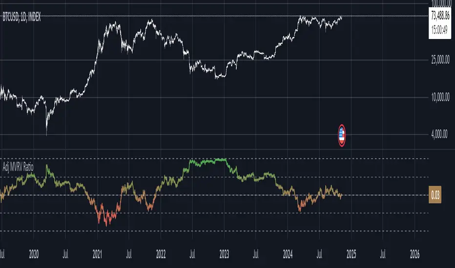 This indicator aims to recreate the Adjusted MVRV Ratio metric available on the CryptoQuant website and display it in standardized values.