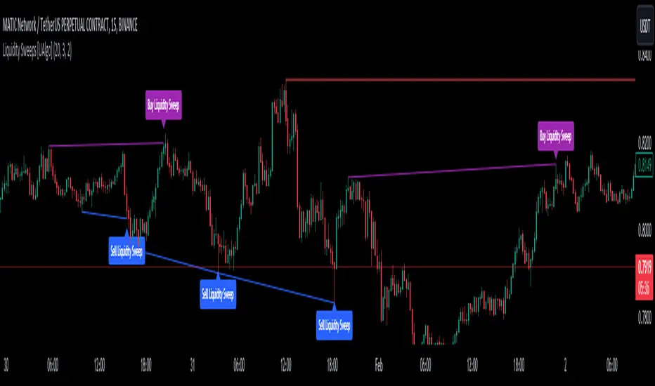 This script, "Liquidity Sweeps by UAlgo" aims to identify and visualize potential liquidity sweeps in the market, assisting traders in spotting significant price levels where liquidity may be targeted by large orders. The script highlights pivot points and draws support and resistance lines based on user-defined parameters. When a liquidity sweep occurs, the script dynamically adjusts the displayed lines and provides annotations, signaling potential buying or selling opportunities.