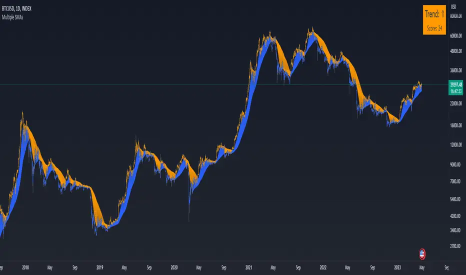 When Close is above of any sma (there are 20 sma's) it scores like 1, every next sma will scores like +1 to previous score. So when we have close above 15 sma's means score 15 and more it is up trend, when below of 15 sma's down trend else it is a ranging market. You can see trends on colors of bars and colors of sma's. Blue bars down trend, orang Up, gray ranging market