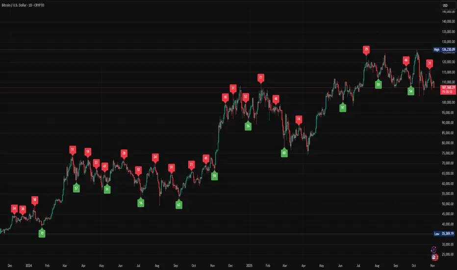 The Bitcoin 60-Day Cycle Tracker automatically identifies Bitcoin's recurring ~60-day price cycle pattern based on methodology pioneered by Bob Loukas, creator of the "Bitcoin's 4-Year Journey" series. While Bitcoin's 4-year halving cycle is well-known, this short-term cycle offers precision timing for entries and exits within the larger trend.