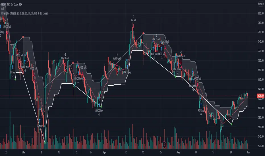 Atrend is a indiactor used to identify long and short term trends it uses MACD, RSI, ATR, and a DEMA along with some pieces from supertrend, the indicator works good on 1-4 hour time frame