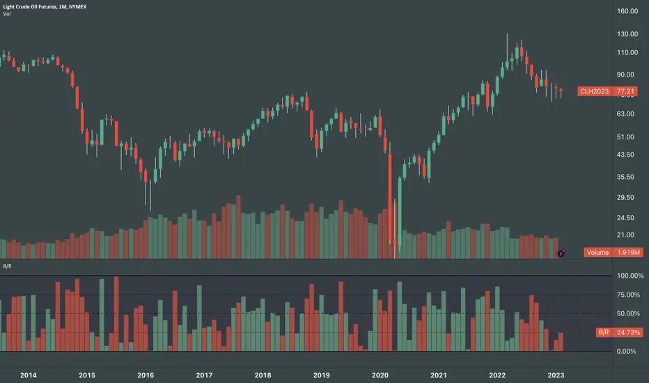 Body / Range is a volatility indicator that shows how many percentages the body candle occupies the range.