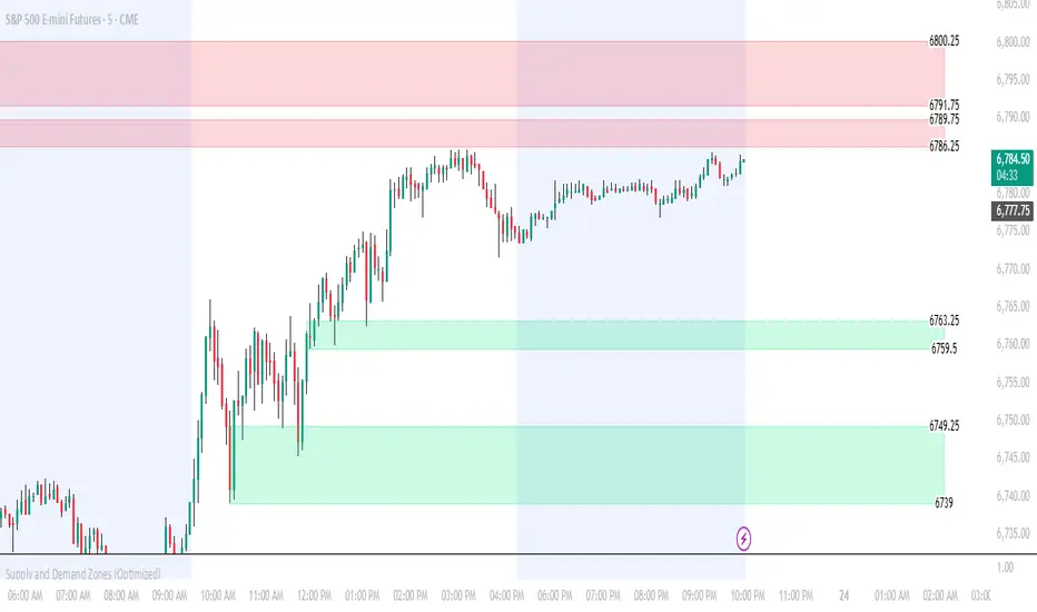 The Supply and Demand Zones (Optimized) indicator automatically highlights important price regions where significant buying or selling interest may have appeared in the past. These areas often help traders visualize potential support and resistance zones, making it easier to understand how price reacts within market structure.