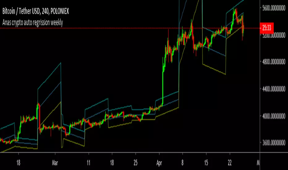 crypto auto regression channel for weekly period , recommend to be used on 4 hours time frame , this will not work on any thing else , only crypto or any 24 hours/7(days) charts , other charts 24/5 , 8/5 , 16/5 will not work .