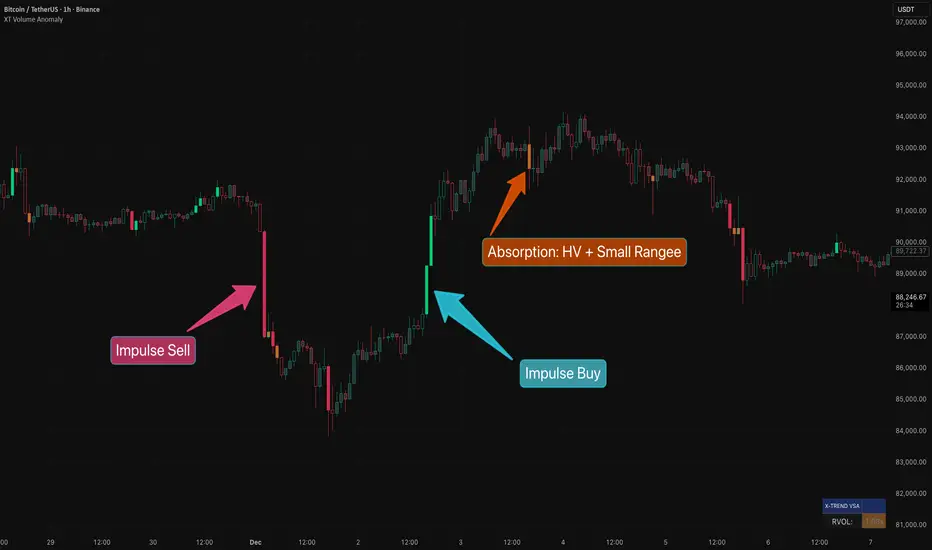 Effective market analysis requires understanding the relationship between Price Action and Volume. X-Trend Volume Anomaly is a technical instrument that simplifies Volume Spread Analysis (VSA) into a clear, visual system. It allows traders to instantly decode the footprint of "Smart Money" by analyzing the correlation between Relative Volume (RVOL) and Candle Range.