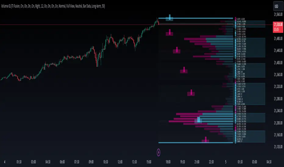 Volume IQ stands out for its originality by offering a data-driven approach to interpreting volume profiles and presenting its analysis on the chart. Unlike traditional volume profiles, Volume IQ automates much of the volume analysis process, helping traders identify potential opportunities and key trading areas with minimal effort. Its unique "Trading Action Zones" leverage high and low volume nodes, sentiment analysis, and current volatility to highlight practical levels for entries, exits, targets, and stops. Additionally, the tool provides grouped bias visuals, gradient coloring, and flexible customization options, allowing traders to gain a clearer understanding of market sentiment and structure. By simplifying complex volume data into actionable insights, Volume IQ provides a valuable and efficient resource for charting on TradingView.
