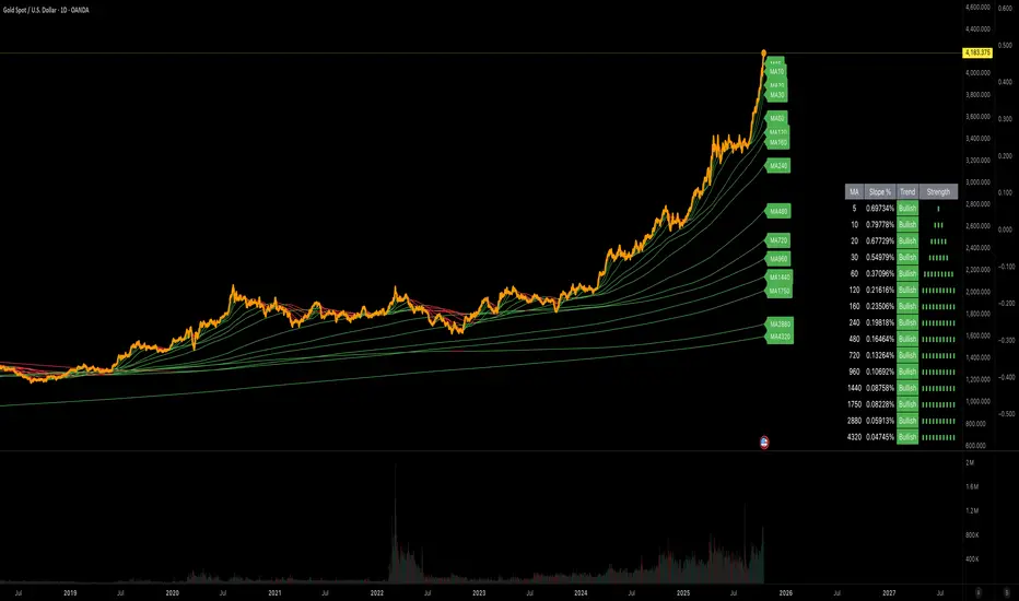 - Normalized “Strength” bars comparable across MA lengths and, optionally,