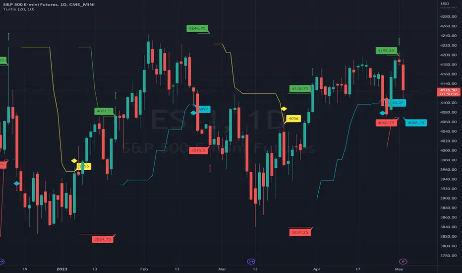 A minimal breakout trend following indicator (Turtle trading). Entry is on the break of a Donchian channel and exit is on the reversal at a shorter-term Donchian channel (trailing stop).