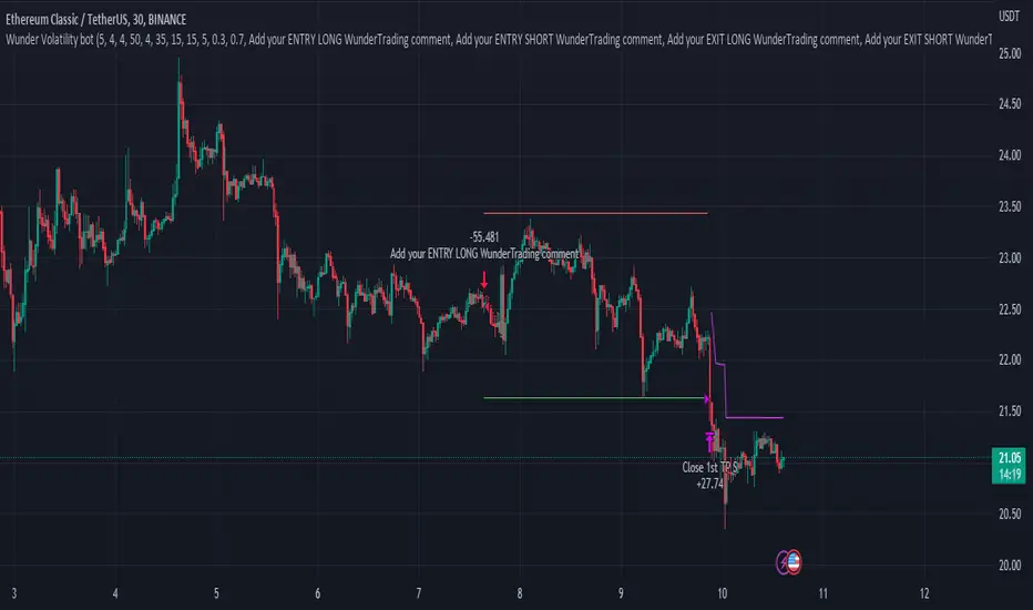 3. A function for calculating risk on the portfolio (your deposit) has been added to the Wunder Volatility bot script. When this option is enabled, you get a calculation of the entry amount in dollars relative to your Stop Loss. In the settings, you can select the risk percentage on your portfolio. The loss will be calculated from the amount that will be displayed on the chart.