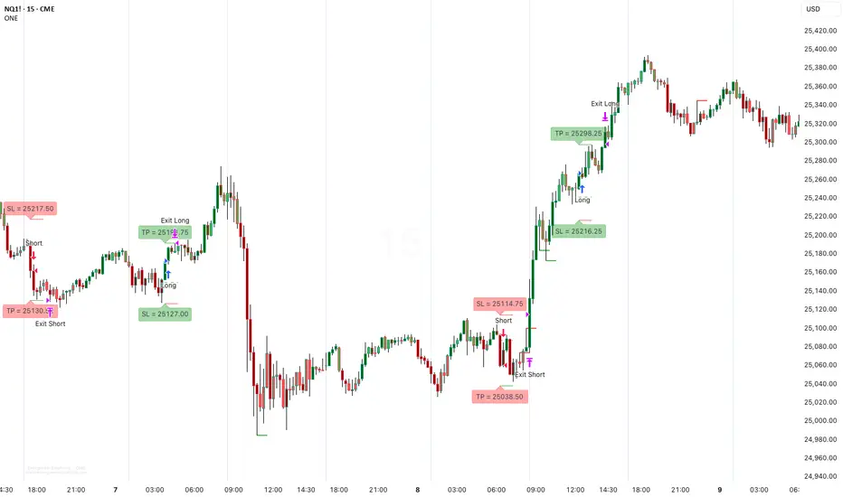 ONE is a strategy designed for all markets that captures short-term momentum in high-volatility conditions. It integrates RSI, volume analysis, chop filters, and moving to identify when markets shift from range-based choppiness to high-probability opportunities. The system is structured to be reactive, focusing on trades with strong volatility expansion and statistically favorable win potential.