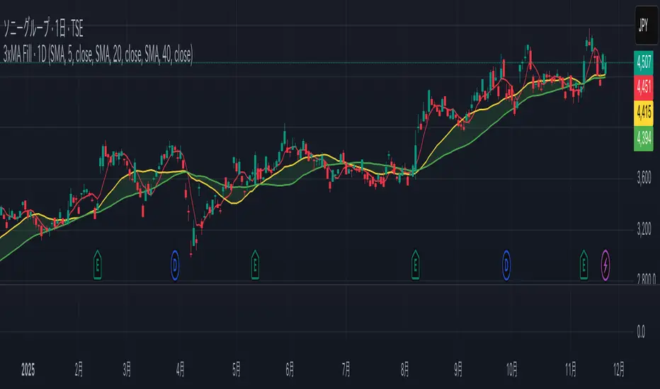 This Pine Script plots three moving averages—MA1, MA2, MA3—each with its own type, length, source, color, and offset. You can independently toggle background fills between MA2–MA1 and MA3–MA2.