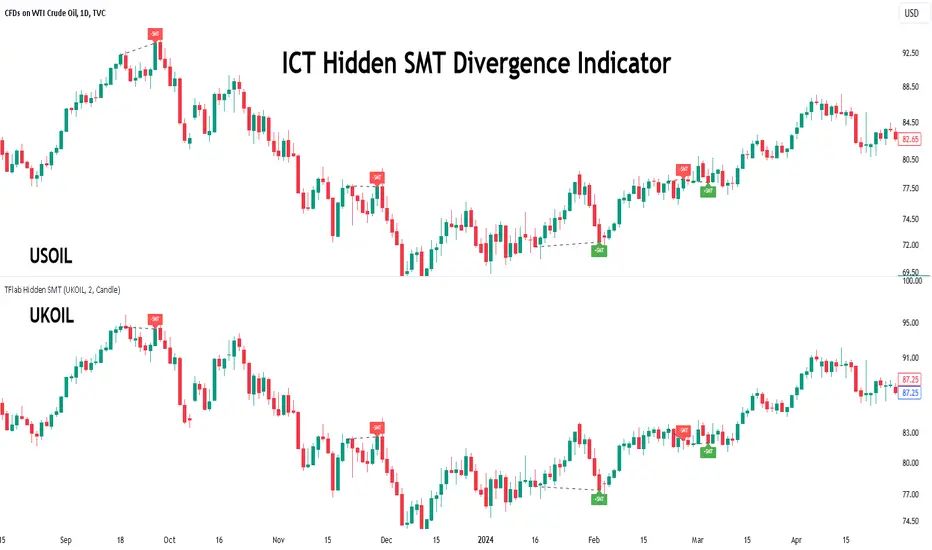 The Hidden SMT Divergence indicator provides traders with a systematic approach to identify market reversals or trend continuations through divergences in closing prices between two correlated assets.