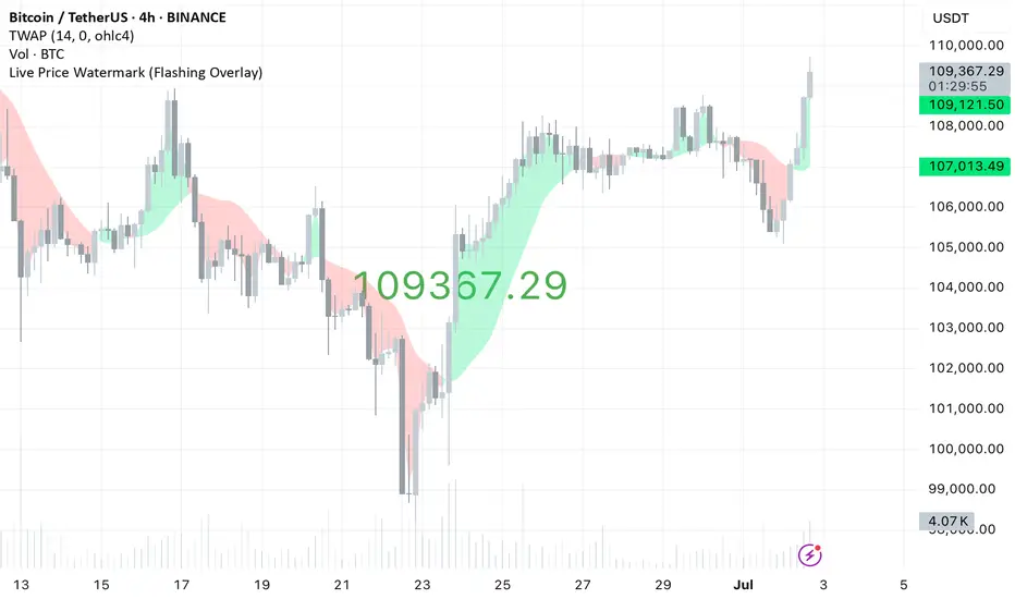 Displays the current price as a large, centered watermark directly on your chart. The text color updates dynamically: