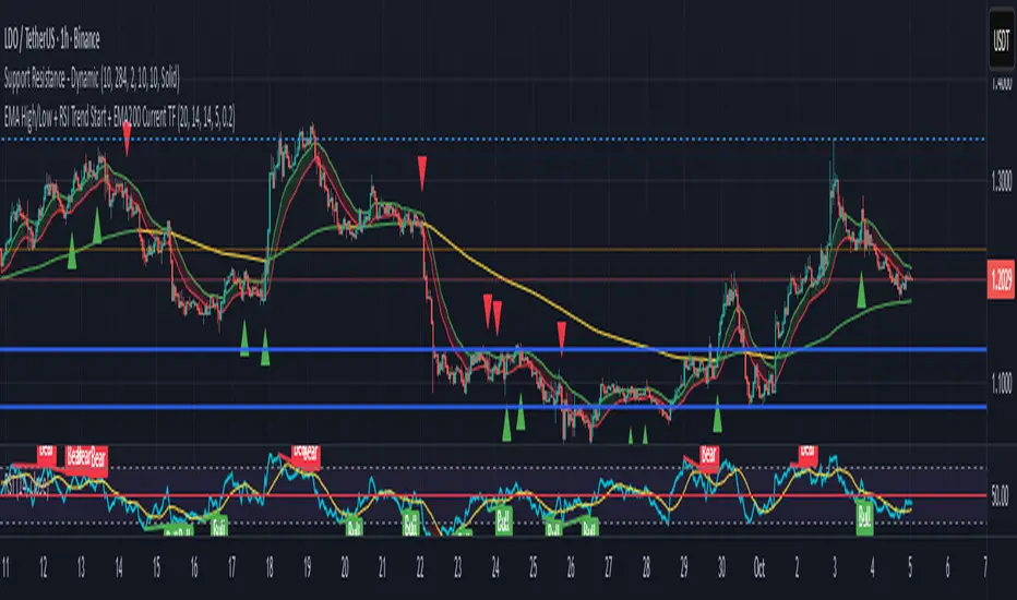 Indicator Name: EMA High/Low + RSI Trend Start + EMA200 Current TF