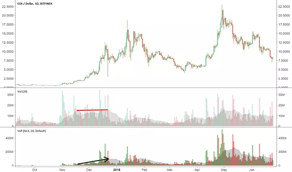 This is a simple indicator that calculates volume times price (money volume). Both asset volume and money volume are important indicators in TA. As you can see in the chart above, money volume (moving average) was increasing while the asset volume was not during late 2017. This could have led to wrong interpretations. Money volume becomes more important to consider when the difference in asset price is 'relatively' high.