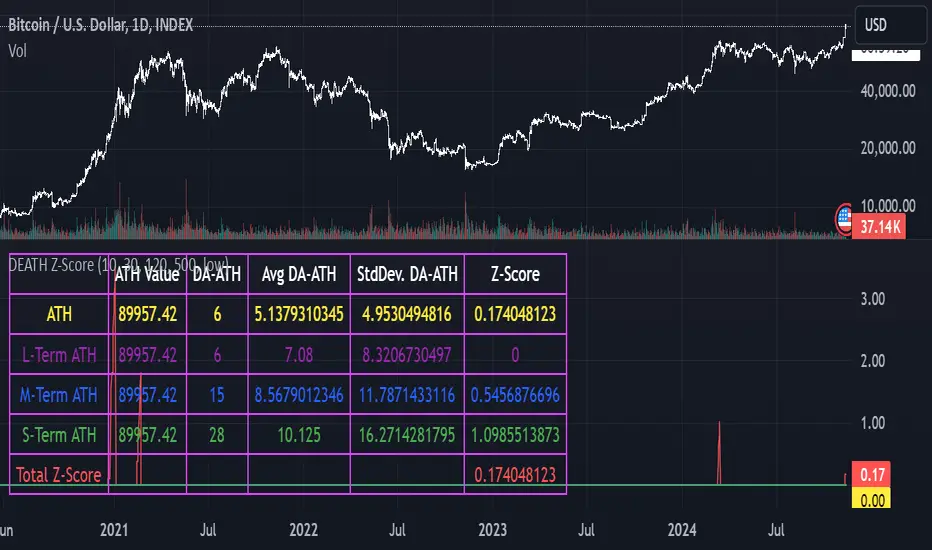This indicator calculates the average number of days that the price is above its last ATH before suffering a significant dump. Then, it uses the average and the standard deviation to calculate the current Z-Score when breaking an ATH.