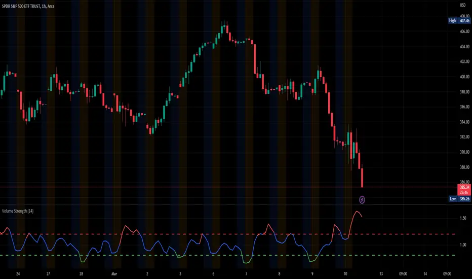 The color of the volume strength line changes based on the current strength level. If the line is above the overbought level, it is colored red. If the line is below the oversold level, it is colored green. If the line is between the overbought and oversold levels, it is colored blue. The indicator also provides alerts for overbought and oversold conditions.