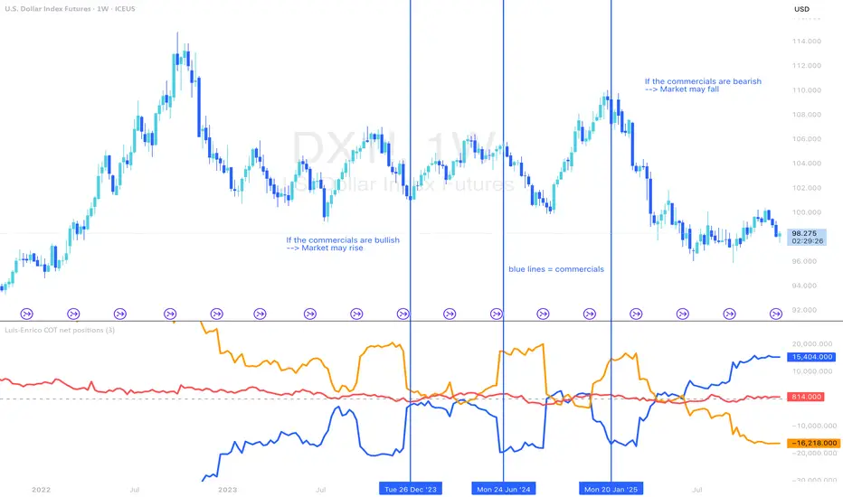 Because COT data is only updated once per week, this indicator is designed specifically for use on the 1W timeframe to ensure a clean and consistent visualization. Applying it on lower timeframes can distort the display and spacing of data points and is therefore not recommended for proper interpretation.