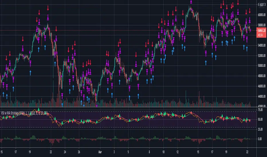 This strategy is mostly for cryptocurrencies, it applies a moving average to an rsi and trades based on the crossings. It includes the indicator that it is made from.