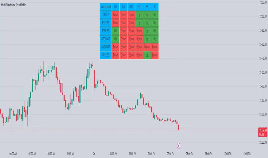 This is the first publication of an indicator to show trend on the higher timeframes and is an English version of the "Mtf Supertrend Table" coded by FxTraderProAsistan. Credit goes to him for the genesis of this work. I updated the original code to Pinescript V.5 and modified it to suit my needs. Please enjoy.