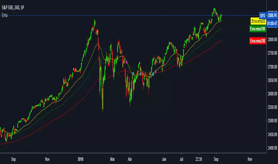Draw a set of 3 EMA: 50, 100 and 200. It highlight with a circle the crossing of EMA(50) with other EMAs