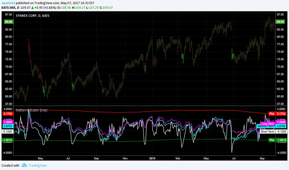 Similar to the StdDev from 200SMA indicator I posted, this looks at the data that way over 20 bars and 110 bars in addition to the 200 bars. Then highlights the bars based on which timeframe the deviations have reached the band on.