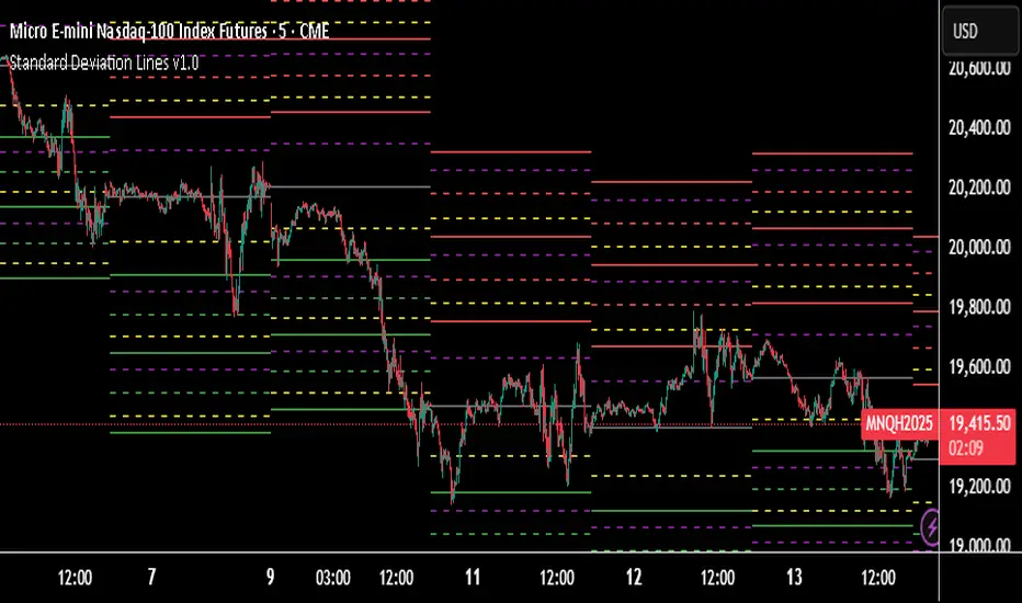 OverviewThe Standard Deviation Lines v1.0 indicator is designed to provide a statistical approach to market volatility by plotting multiple standard deviation levels based on price action. This tool helps traders identify key price levels where the market may experience significant reactions, making it useful for trend analysis, support/resistance identification, and volatility-based trading strategies.
