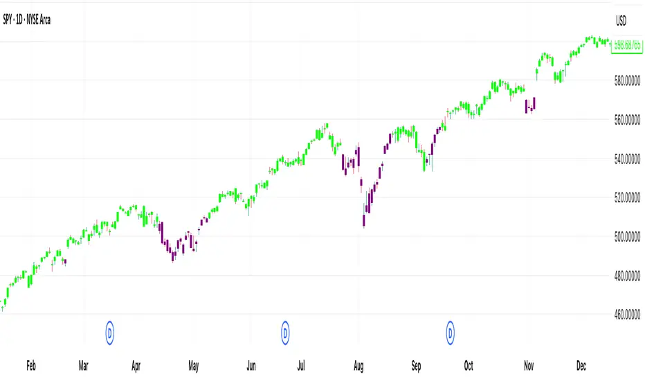[DEM] RMEMA Bars is a multi-factor trend confirmation indicator that combines a double-smoothed moving average with momentum, trend direction, and price position analysis to generate color-coded bar signals. The indicator uses an RMA-smoothed EMA (21-period EMA smoothed by 5-period RMA) as its primary trend filter, while incorporating four additional technical conditions: price position relative to recent highs/lows over a 20-period window, Parabolic SAR directional bias, relative positioning of recent highs versus lows, and MACD momentum direction using extended parameters (50/100/21). Green bars appear when price is above SAR, recent highs dominate recent lows, MACD is positive, and the smoothed moving average is rising, while red bars signal the opposite conditions with price below SAR, recent lows dominating, negative MACD, and falling moving average. Purple bars indicate mixed or transitional conditions where not all criteria align, creating a comprehensive visual system that requires multiple technical factors to confirm before signaling strong bullish or bearish conditions.