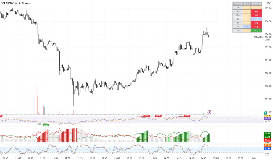 This indicator displays RSI and Stochastic RSI values across multiple timeframes