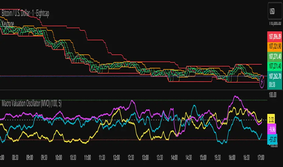 Each Keyzone adapts automatically to price movement, helping traders see where market participants are likely to react. The shorter zones (3, 8) capture quick pullbacks, while the longer zones (21, 89) reveal deeper institutional levels. This makes Keyzone a clear, multi-layered visual map of market structure that adjusts with every new candle.