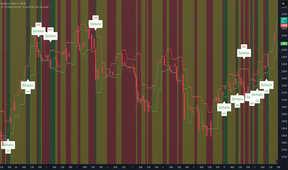 Distribution Phase: When price finally closes cleanly outside the zone, it draws another shaded area and drops a “Distribution” label plus a big LONG or SHORT arrow on that bar.