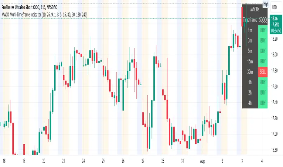 MACD Multi-timeframe indicator. This indicator will have built-in alerts for Micro trading, daytrading, and swing trading. Each will be based on 3 timeframes going in the same direction simultaneously. When this occurs, a built-in alert (that must be setup first) will alert that it may be a good time to enter or exit.