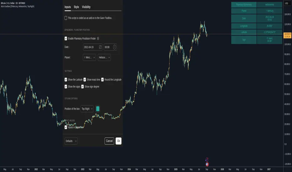 The Astro ToolBox - Community Edition delivers accurate ephemeris data, calculating the ecliptic longitude and latitude of celestial bodies for any selected date. Supporting the Sun, Moon, Mercury, Venus, Mars, Jupiter, Saturn, Uranus, Neptune, and Pluto, this script offers both heliocentric and geocentric perspectives with high precision (within 1-2 arc seconds), it provides traders with a robust dataset for time-based analysis, enhancing Gann-inspired trading strategies.