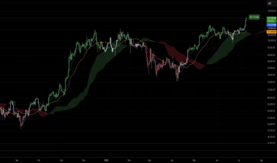 This indicator is a customized, volume-weighted variation of the classic Ichimoku Kinko Hyo system, designed to provide traders with an "at-a-glance" visualization of trend conviction and exhaustion. It overlays dynamic candle coloring on your chart, using a smooth gradient from deep green (strong bullish conviction) to gray (neutral or exhausted) to deep red (strong bearish conviction). The colors are driven by a composite score (-10 to +10, displayed as -100% to +100% strength), which quantifies probabilistic bias based on historical Ichimoku patterns, normalized for volatility and enhanced with volume dynamics.