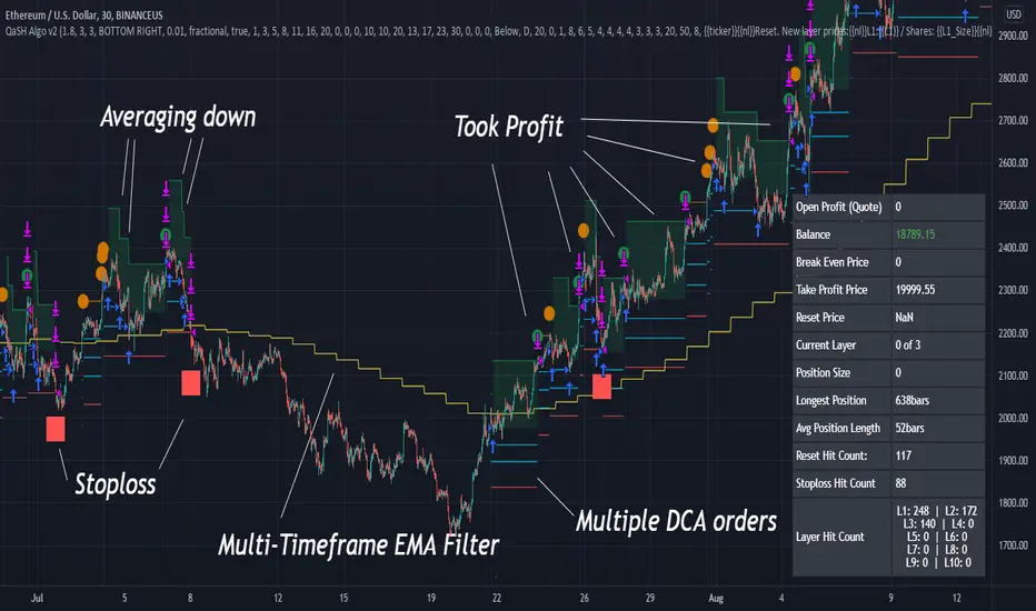When the specified entry condition has occurred, the indicator will set up several limit orders below the current price. If price goes up a specified amount, then the layers will be overwritten at the higher prices. If price goes down and fills the first layer (limit order), then the Take Profit price is plotted and will be sent in an alert. If more layers are filled, then the TP price will move down accordingly as it’s based on the average entry price (alerts on each TP update). This action of lowering the average entry and TP price mitigates your risk, and increases the likelihood of a Take Profit event happening. This script uses a simple "ASAP" mode, where each deal will start exactly 2 bars after the last trade ended. An EMA filter and stoploss function was also added for risk management.