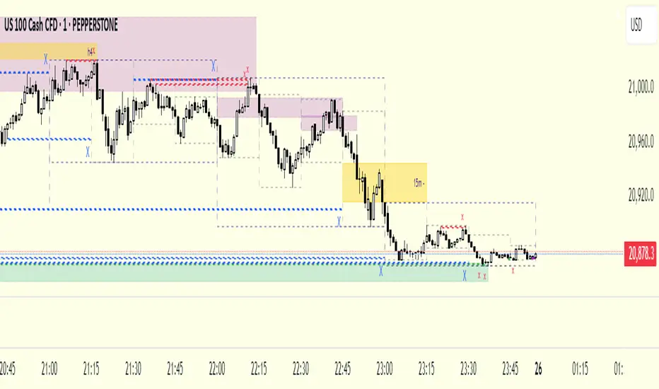1- Tracks the price in the higher timeframe it is alignment with, when the price violates the previous candle in the new candle (high/low), the previous candle's zones between top/bottom - middle levels.