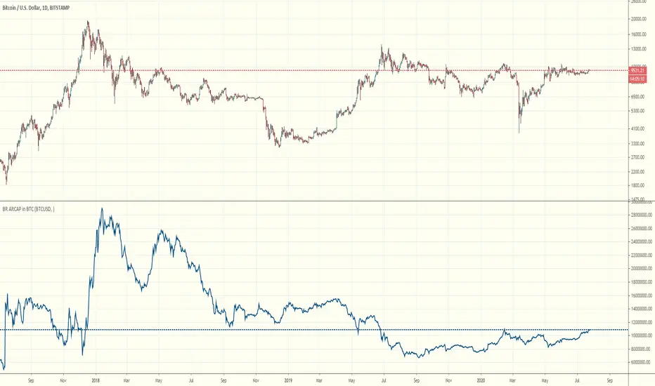 Plots AltcoinMarketCap in BTC. Potentially good times for accumulating BTC with Alts if this ticker shows an uptrend. :)