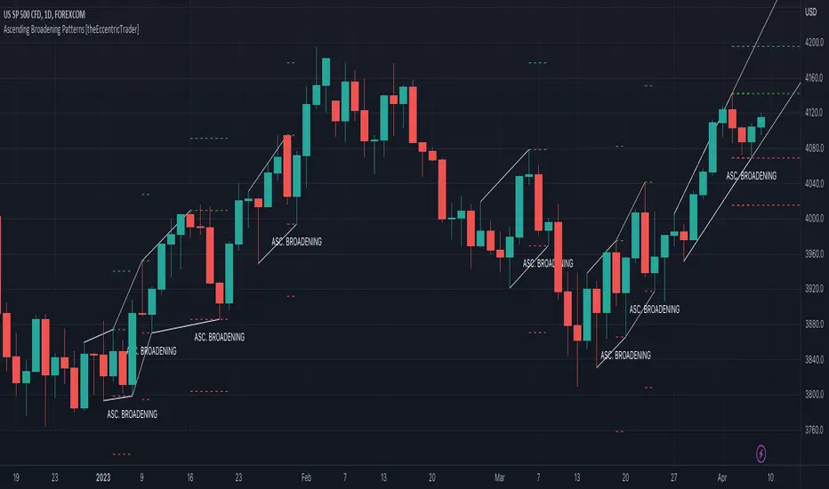 Ascending broadening patterns are generally characterised by ascending diverging trendlines drawn from four points that form a broadening shape, or megaphone. Traders typically look for breakouts or breakdowns of ascending broadening patterns to identify potential trading opportunities, with targets and stop losses set as multiples of the pattern's range.