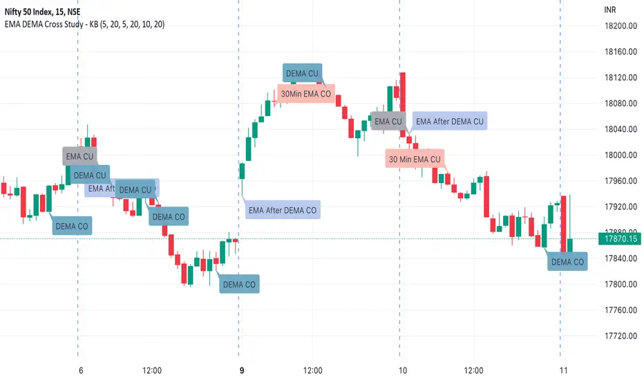This script is created to check cross of two EMAs after their DEMA cross (for Nifty and BankNifty). It also has an option to show the cross as it happens in the 30 min timeframe on the lower timeframe chart.