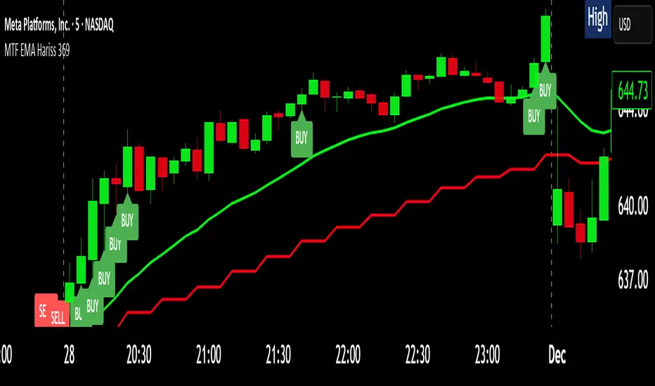 Sell signal is plotted when price closes below CTF 20 EMA and CTF 20 EMA is below HTF 20 EMA RVOL is greater 1.5.